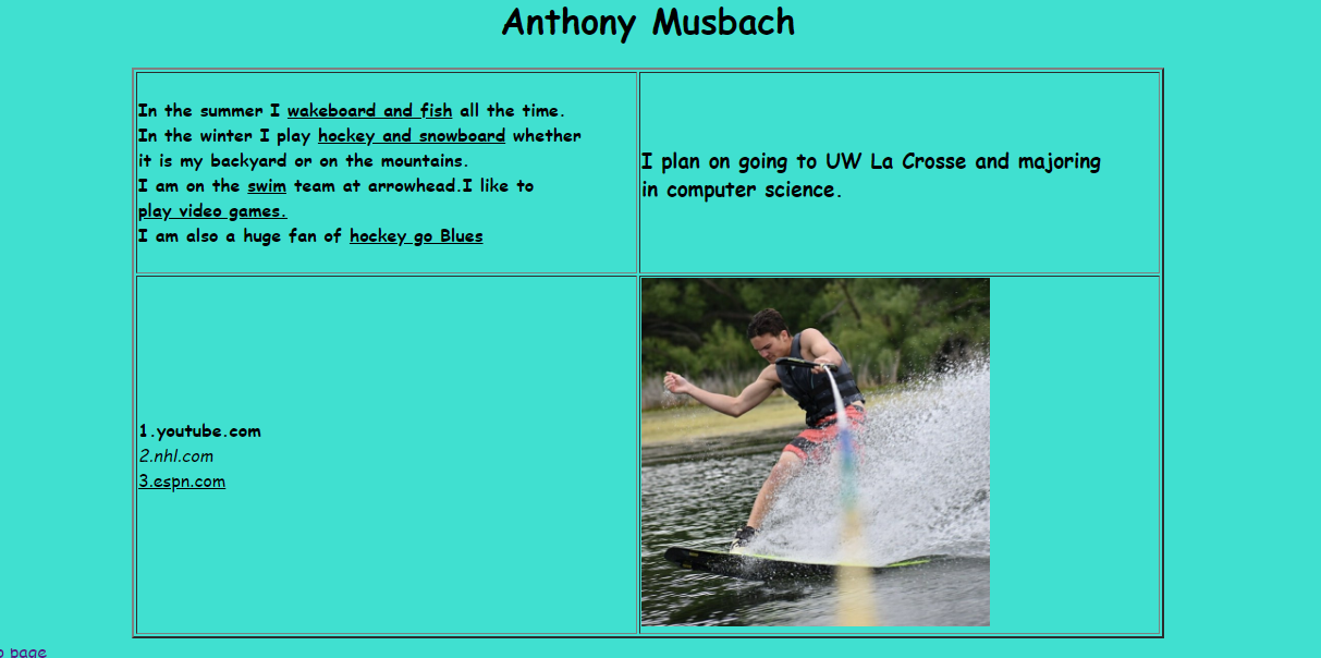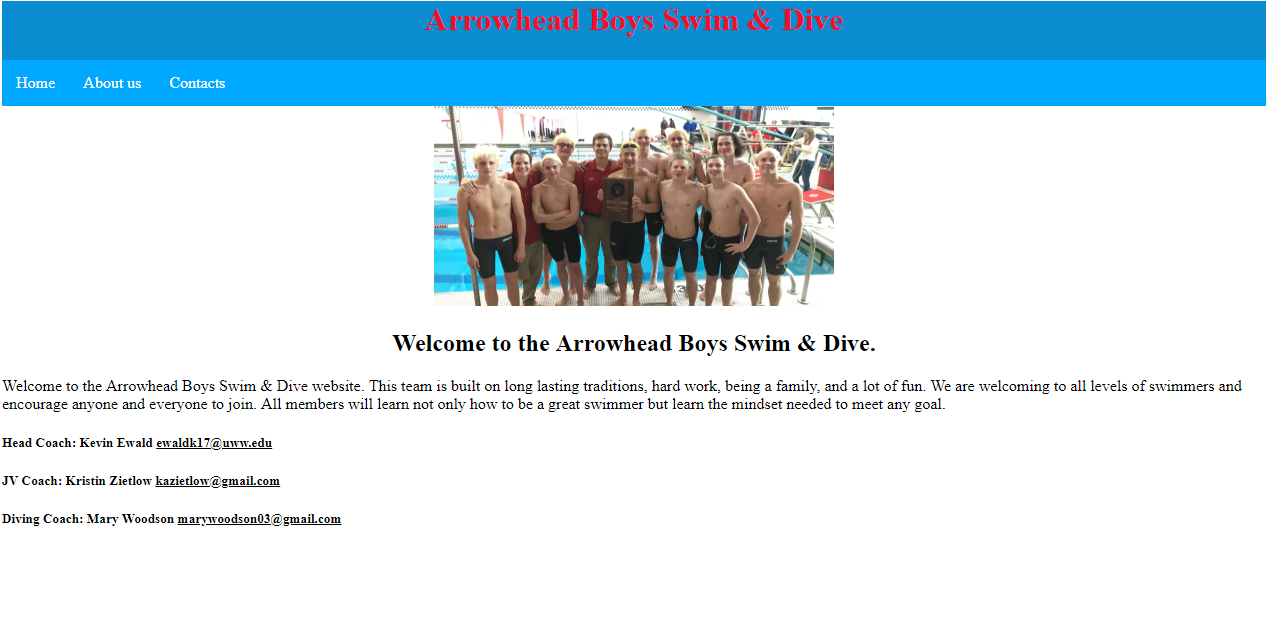 This is a website I design for the Arrowhead High School Boys Swim and Dive. this website gave background information about the team and it’s coaches. The website gave information about what the is expected from you if you were to join the team and what the team is based on. IT also gave the contact information of the coaches.This is a site I created for the Apostle Islands. This site featured many images of the beautiful landscape and activities done at the Apostle islands. The site gave information about activities that you are able to do. It also had an interactive map so that you can find the location of the park and get directions from your location. It also has a contacts page for any help you may need from the people that work at the Apostle Islands office.